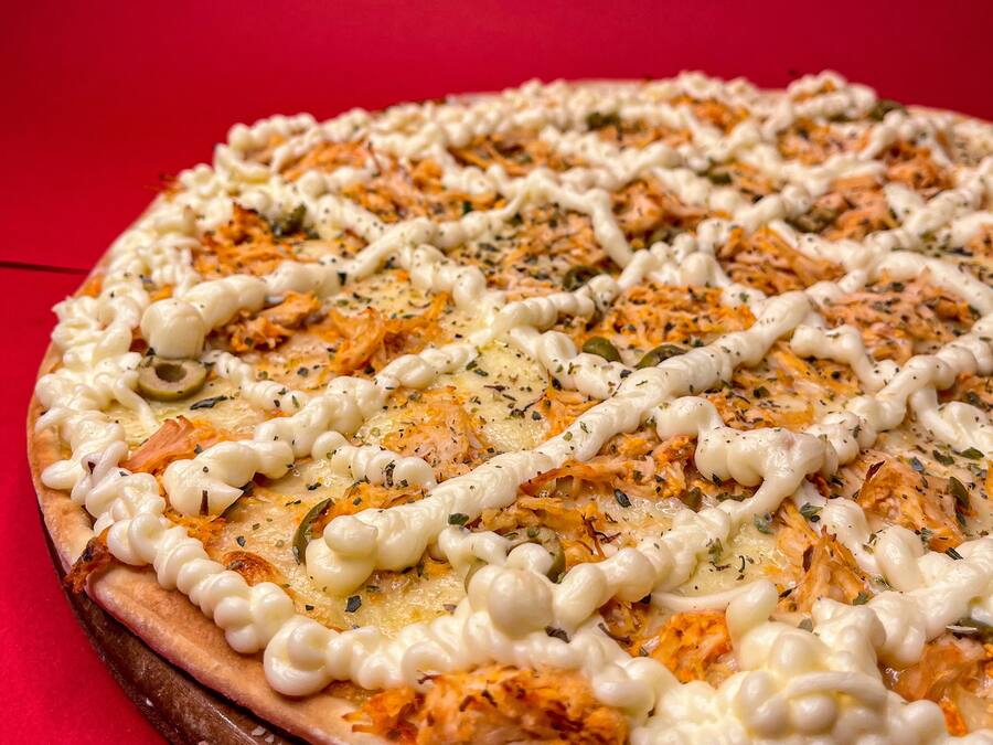 Delicioso molho de tomate artesanal, mussarela, frango desfiado, Catupiry e orégano para finalizar.
